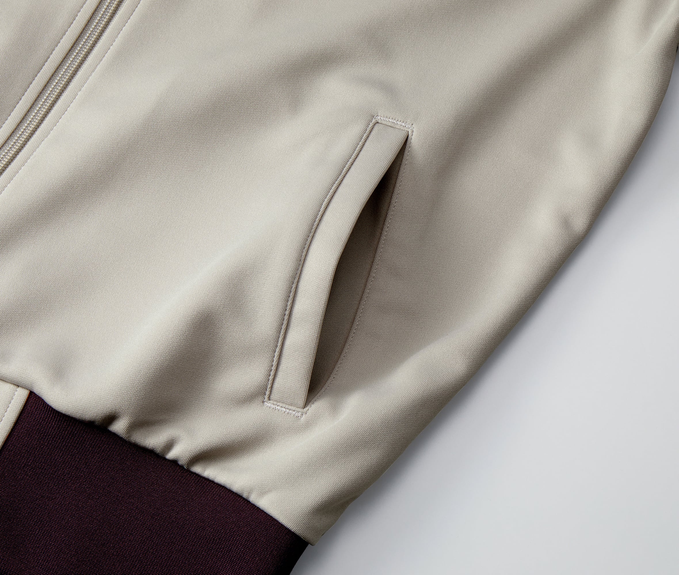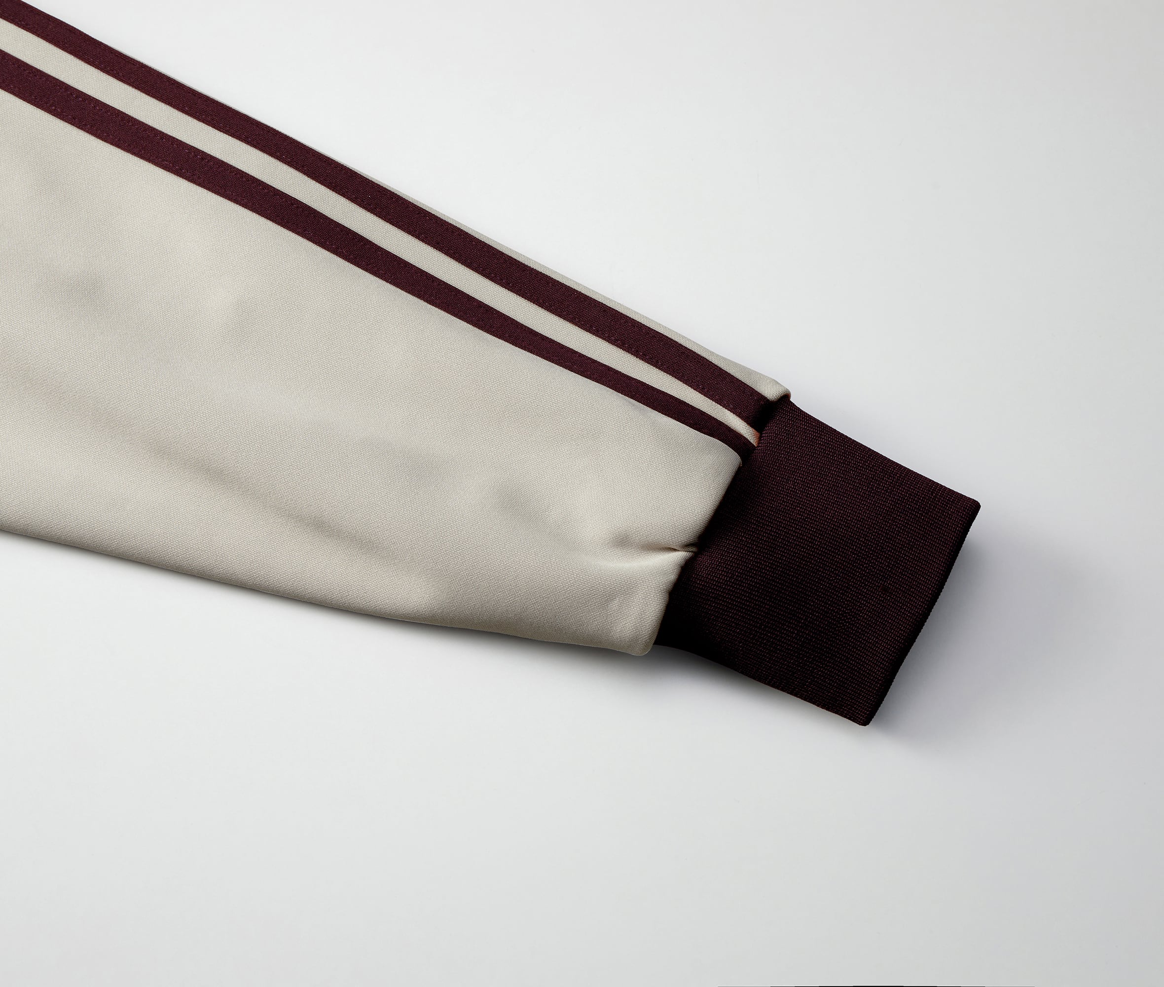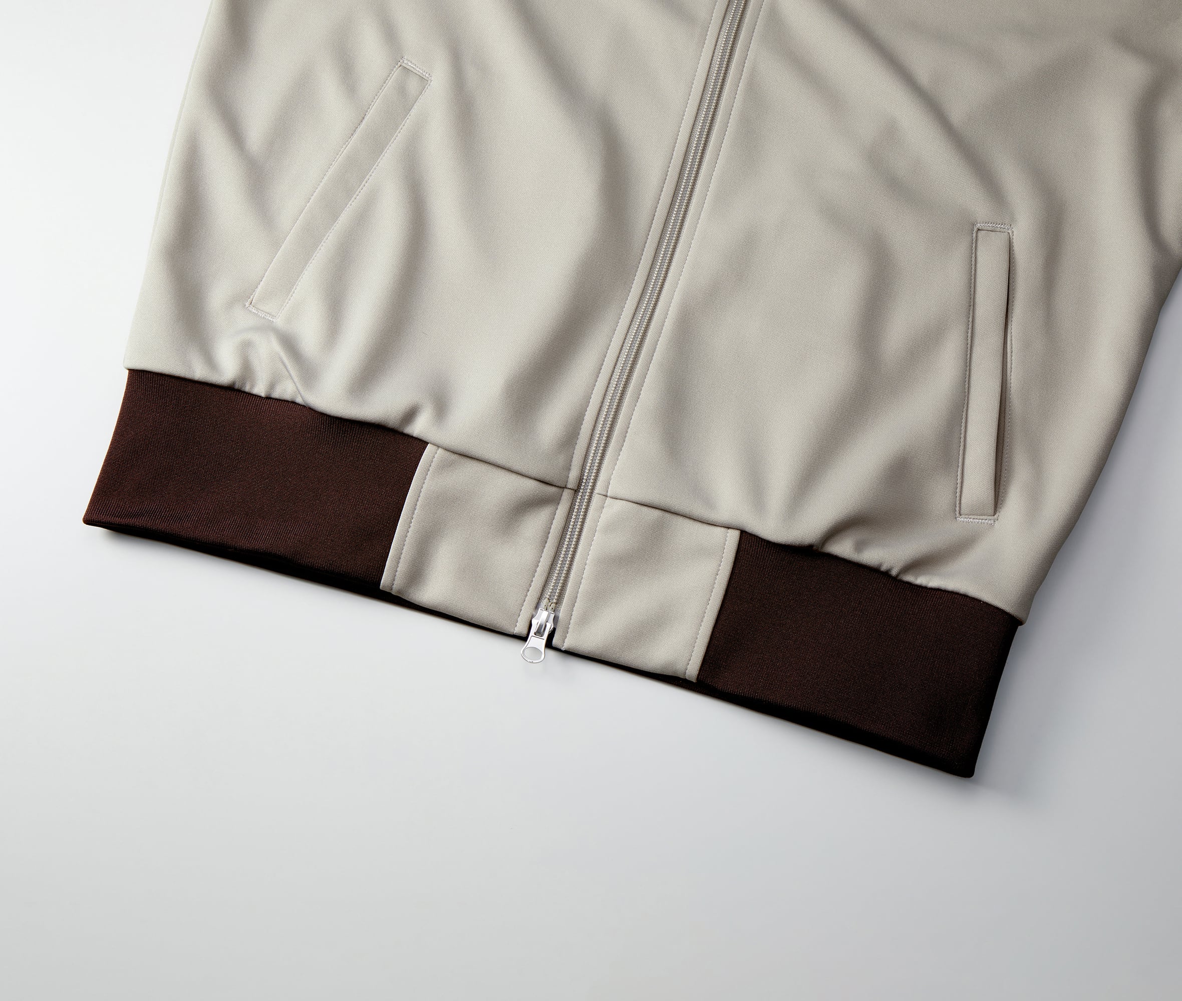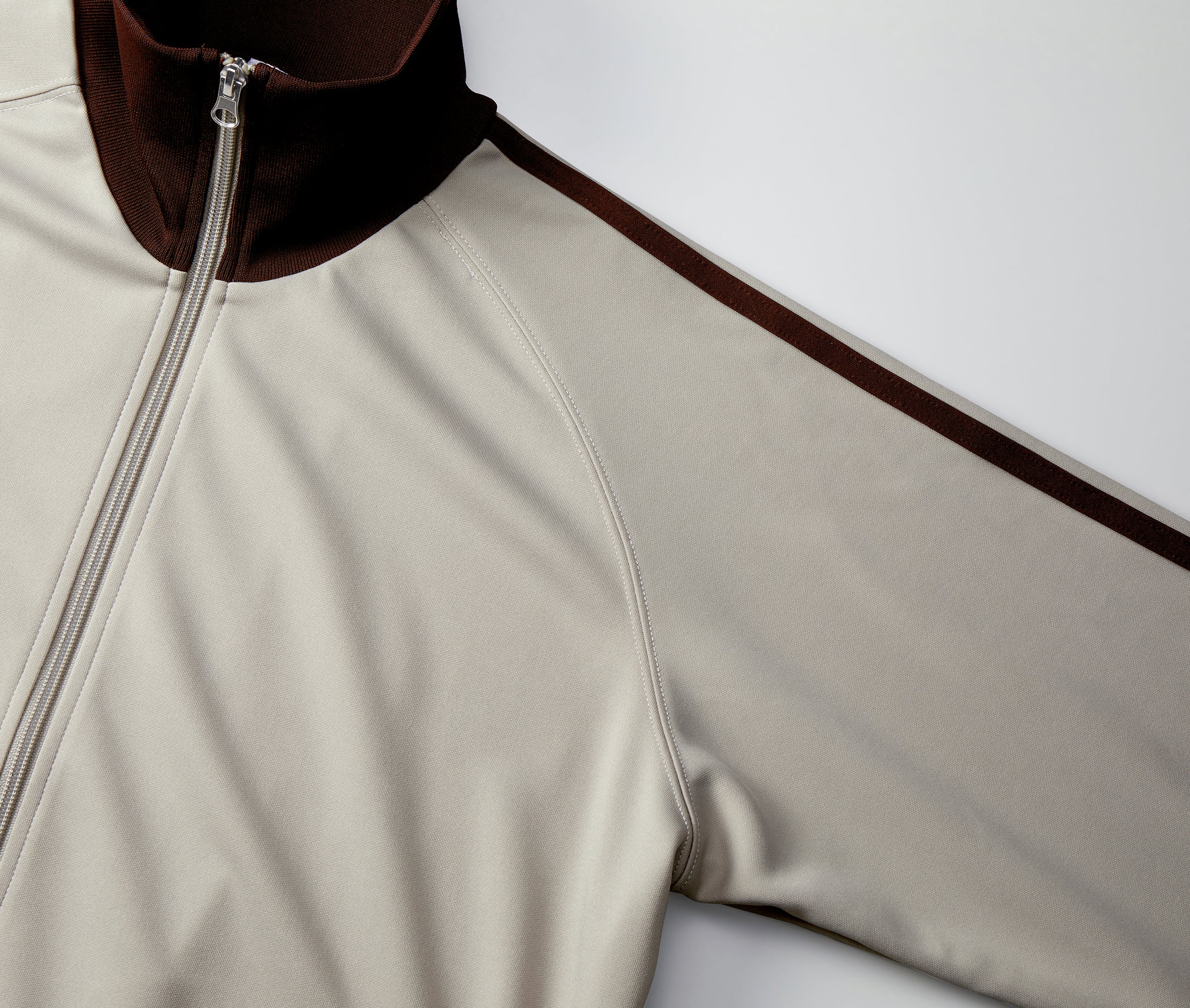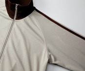 トラックウエア。ラグラン仕様で腕まわりの動きやすさを確保し、袖口と裾口は風を通しにくい